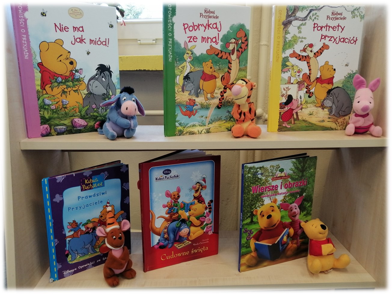Książki do wypożyczenia w bibliotece o tematyce Kubusia Puchatka