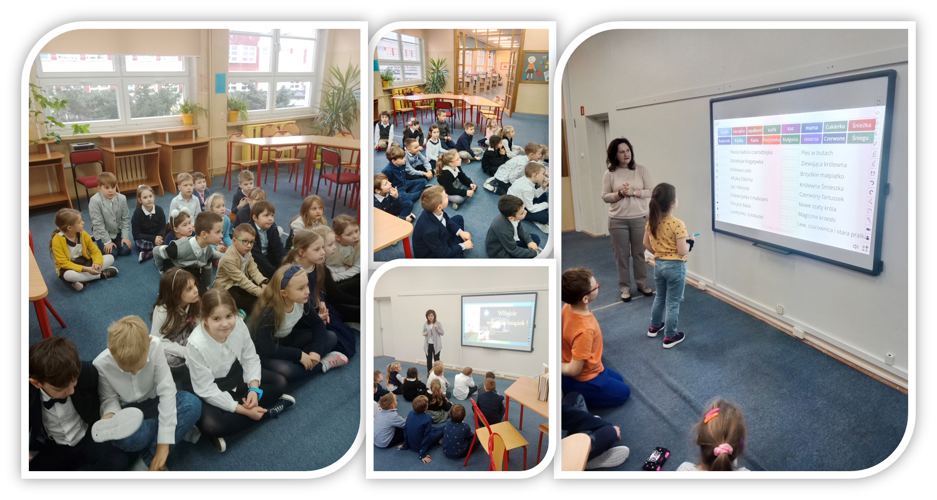 Następnie dzieci przeszły do czytelni, gdzie dobrze się bawiły śpiewając piosenki, odgadując zagadki oraz dyskutując o zaletach płynących z czytania. Uczniowie obejrzeli także krótkie filmiki przygotowane przez naszych czytelników prezentujących swoje ulubione książki. Wysłuchały również skarg i próśb książek o ich szanowanie.